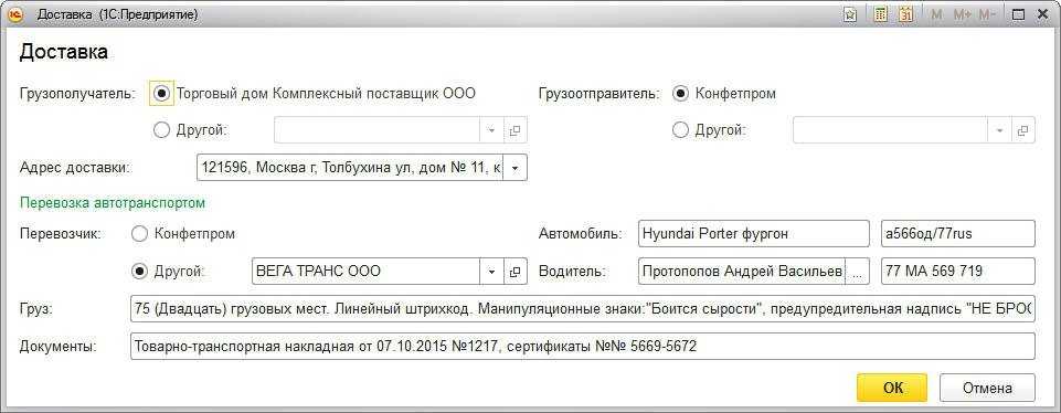 Рис. 2. Дополнительные реквизиты по доставке товара