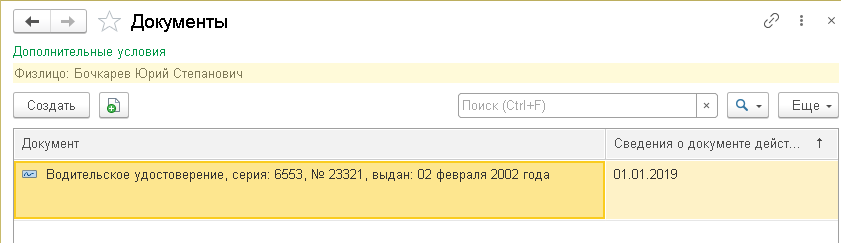 Сведения о водительском удостоверении можно заполнить в форме элемента справочника «Физические лица».