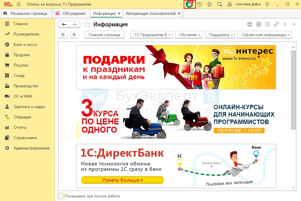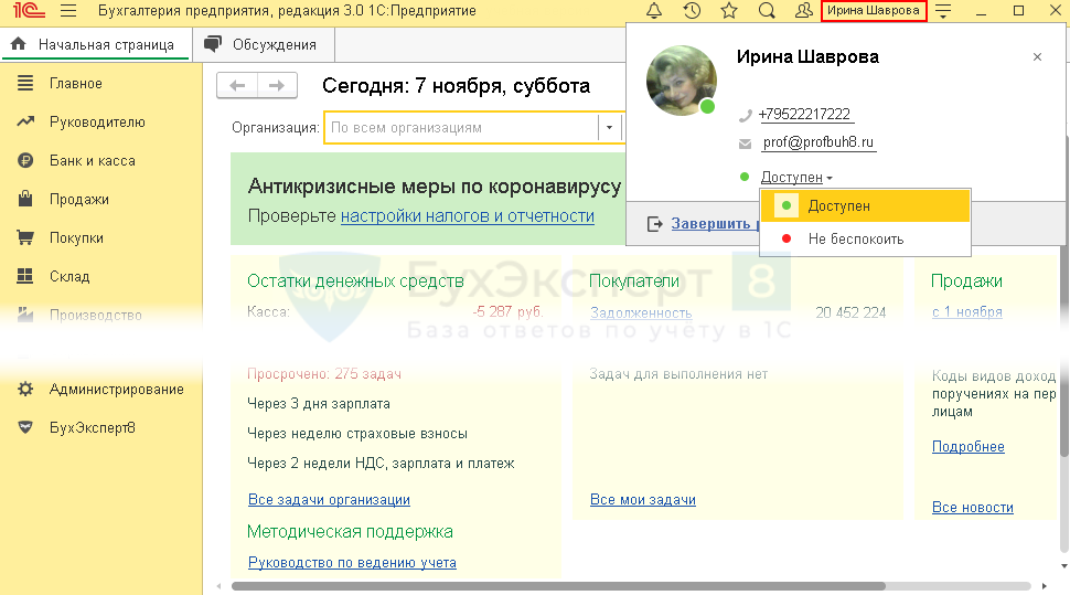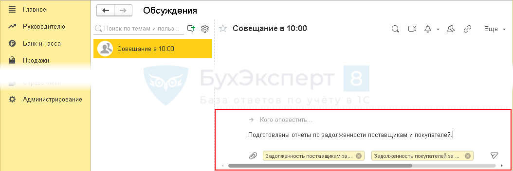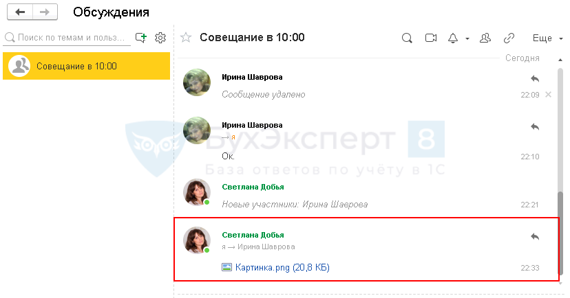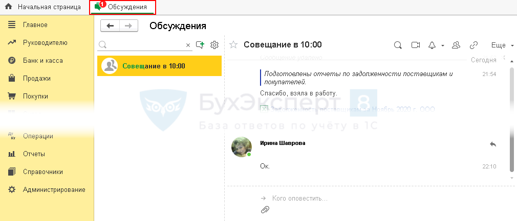 Разработчики дополнили функционал видеозвонков, обмена файлами и картинками в чате обсуждения между пользователями, сделали понятной и удобной систему оповещения в 1С.