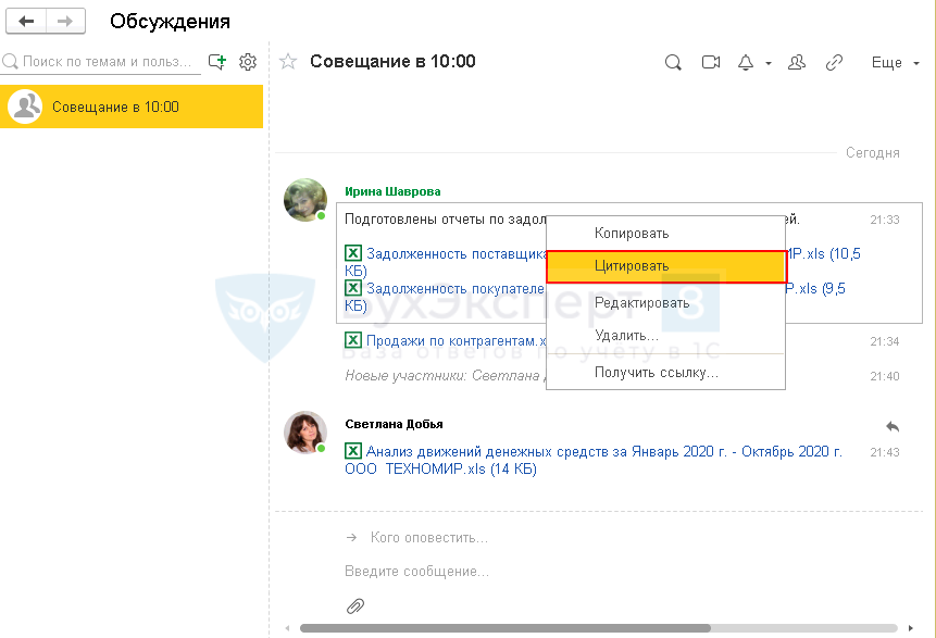 В Платформе 8.3.18 реализована возможность цитирования сообщений. В контекстном меню выделенного текста добавлена новая команда Цитировать.