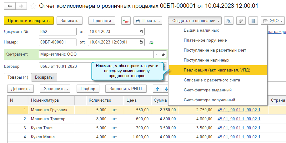Рис. 2. Журнал Реализация товаров и услуг в интерфейсе