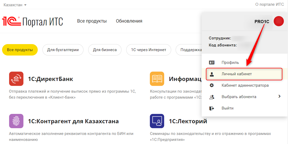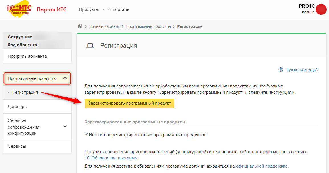 Для регистрации используемого вами программного продукта 1С на портале 1С:ИТС, следует выполнить вход под «собой» и перейти в раздел Личный кабинет.