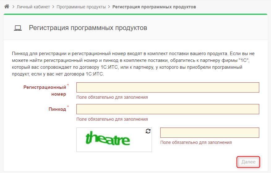 После заполнения обязательных полей на странице регистрации и нажатия кнопки Далее в личном кабинете в разделе Программные продукты появится прошедший регистрацию продукт 1С.