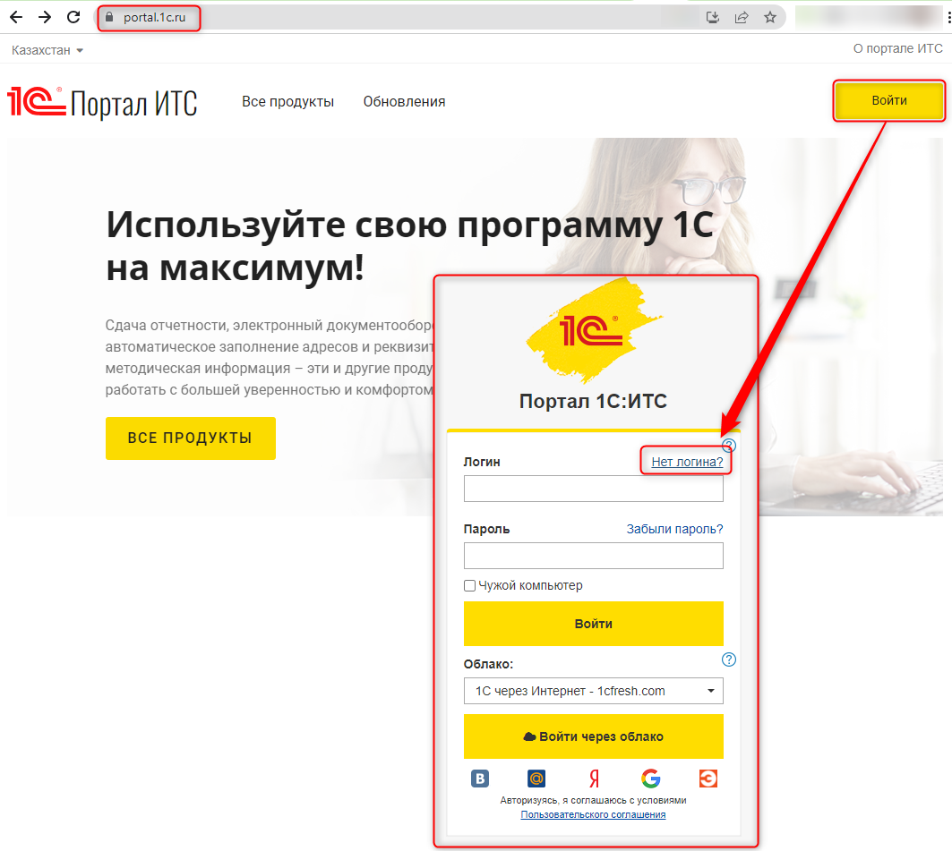 Если вы не зарегистрированы на портале 1С:ИТС, то зайдя на сайт https://portal.1c.ru/ в правой части экрана нажмите кнопку Войти и затем в открывшемся окне регистрации нажмите ссылку Нет логина?.