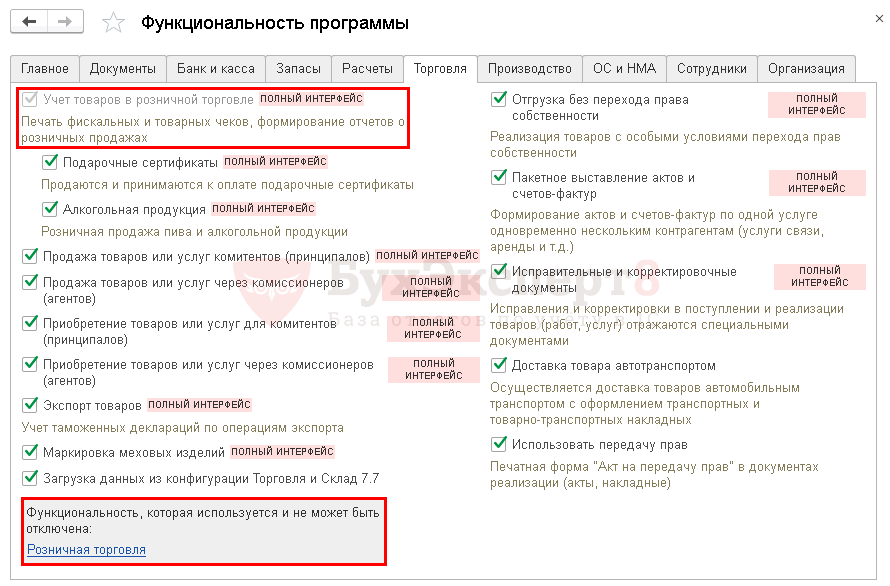 В течение работы в программе 1С вы можете изменять Функциональность — добавлять новые виды учета, которые у вас появились, или удалять неиспользуемые. При этом не будет возможности убрать функционал, который уже был использован, пока все документы по нему не будут удалены.