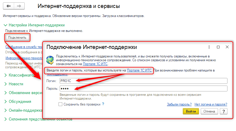 Для подключения программы 1С к официальной поддержки необходим доступ к интернету и регистрация на портале 1С:ИТС (логин и пароль для входа в личный кабинет сайте https://portal.1c.ru/).