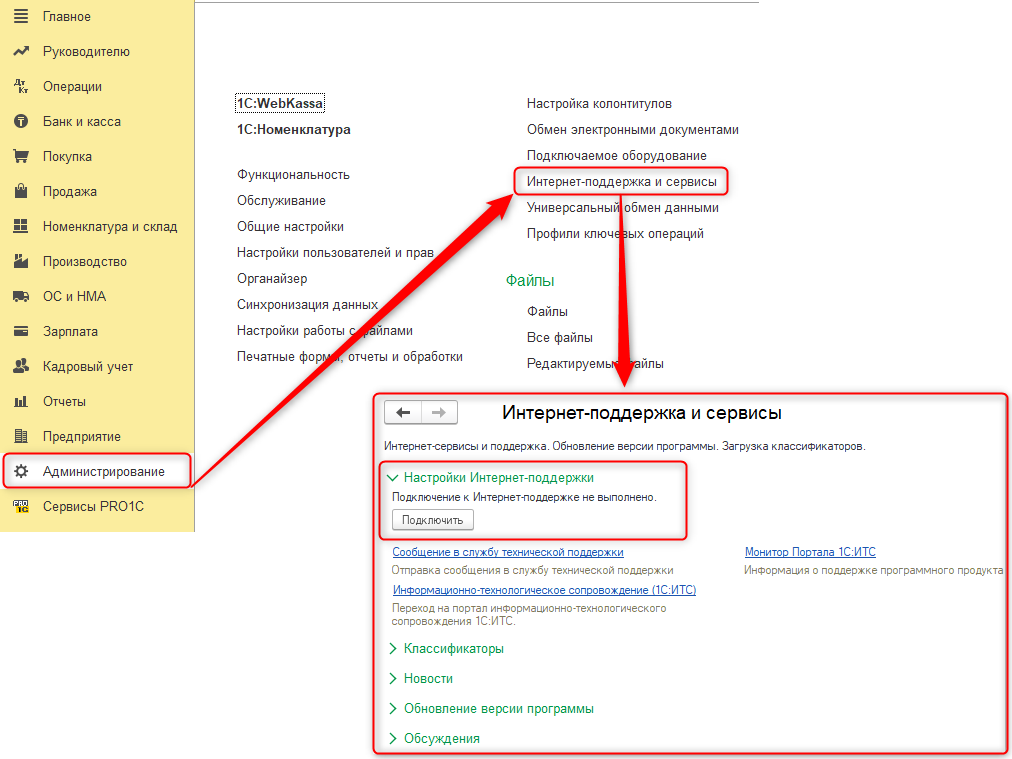 Подключение Интернет – поддержки учетной системы 1С выполняется в разделе Администрирование – Интернет–поддержка и сервисы в блоке Настройки Интернет-поддержки.