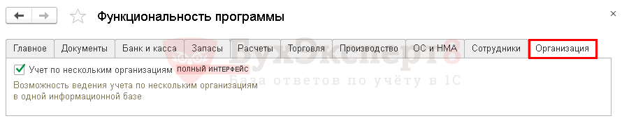 Если вы предполагаете вести учет нескольких организаций в одной базе, включите это на вкладке Организация.