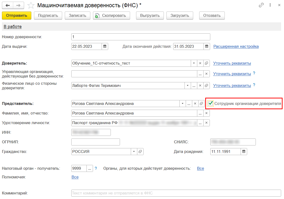 - Указать в свойствах организации, если это не было сделано ранее, кто подписывает отчетность в соответствующие контролирующие органы. Если отчетность подписывает не руководитель организации (или индивидуальный предприниматель, для отчетности индивидуального предпринимателя), то проверить наличие актуальной машиночитаемой доверенности. И если ее нет, то создать и выбрать нужную машиночитаемую доверенность.