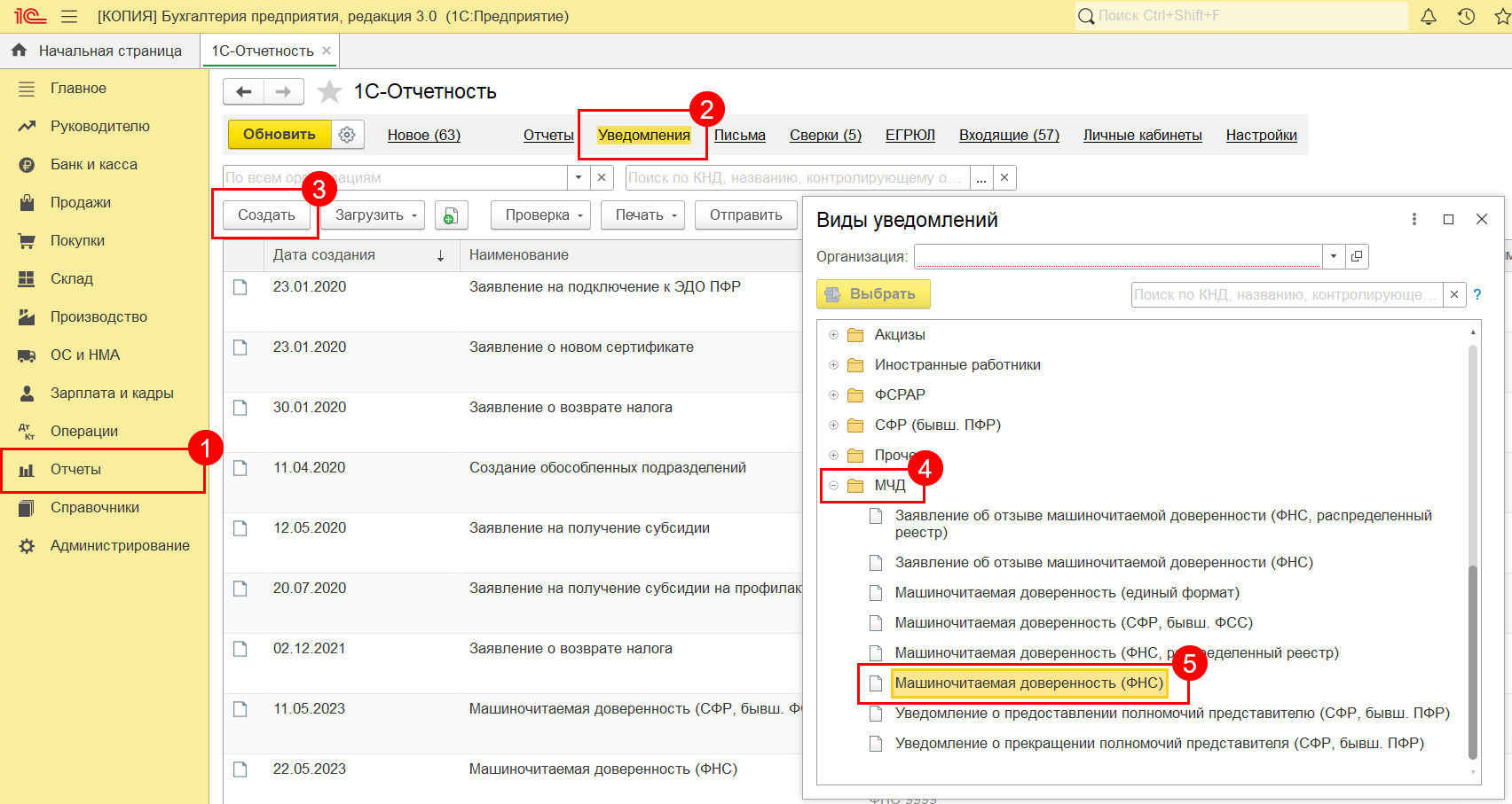 Для создания МЧД в БП 3.0 перейдите в Отчеты (1) → Уведомления (2)→ Создать (3)→ МЧД (4) → Машиночитаемая доверенность (ФНС) (5):
