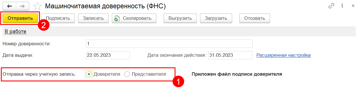 После подписания выберите с какой учетной записи будет произведена отправка МЧД (1) и нажмите кнопку Отправить (2):