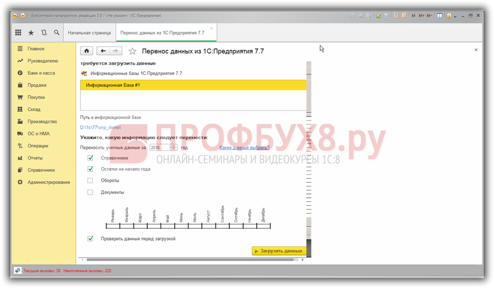 Загрузить данные из информационной базы – программа 1С 8.3 сама найдет установленные базы и попробует подключиться к этой информационной базе, скопировав оттуда данные. С помощью настроек можно указать что необходимо загружать и нажать кнопку Загрузить данные: