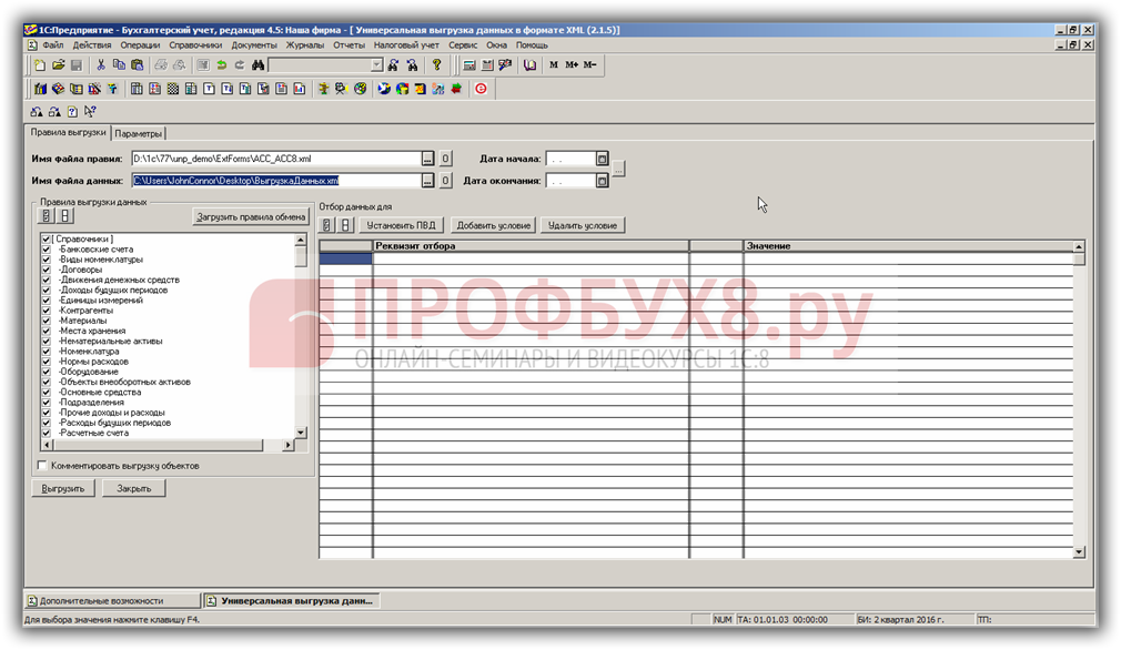 - Правила выгрузки данных – объекты для выгрузки, справочники и документы, которые будут выгружены в файл: