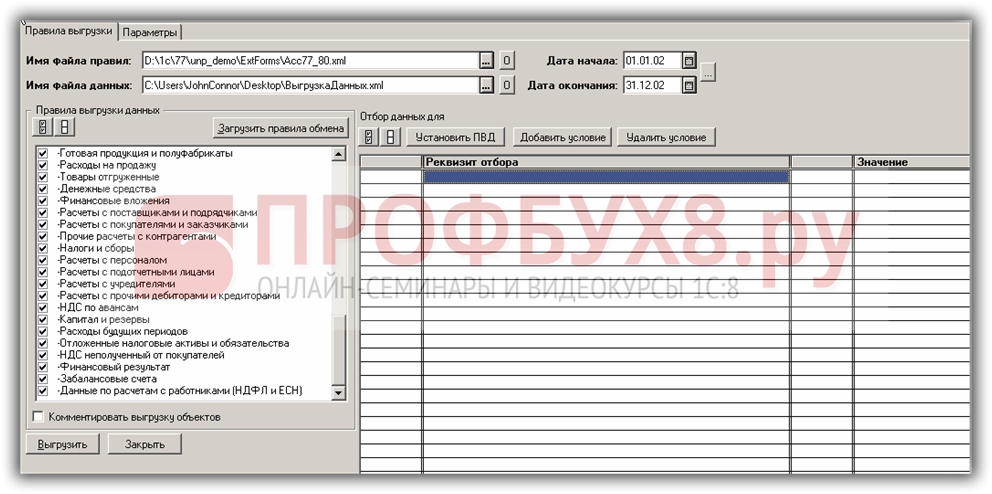 - Правила выгрузки данных – объекты для выгрузки, справочники и документы, которые нужно выгрузить в файл.