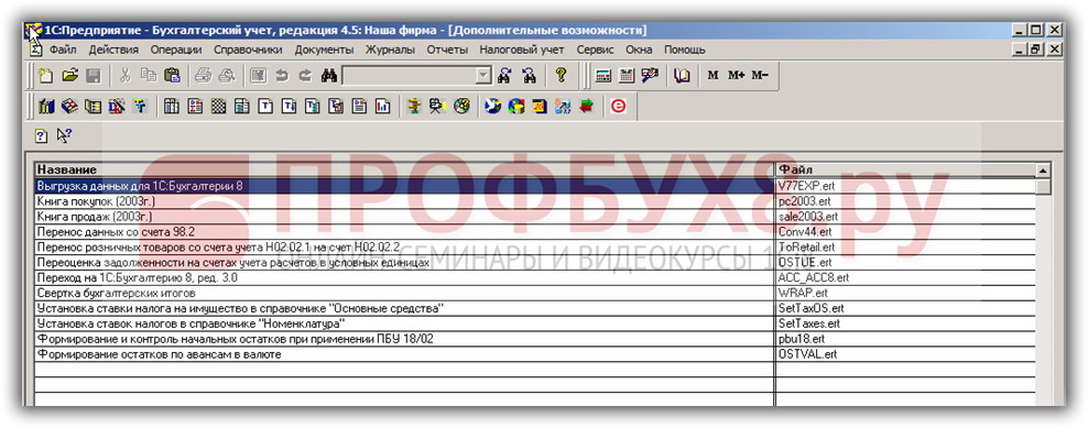 Запустим эту обработку: Сервис – Дополнительные возможности. Если все сделано правильно, то должна появиться надпись – Выгрузка данных для 1С Бухгалтерия 8, выберем ее по кнопке Открыть: