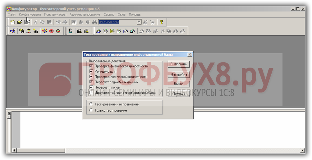 Удалить помеченные на удаление объекты и сделать Тестирование и исправление базы 1С. Для этого в режиме конфигуратора через верхнее меню программы Администрирование – Тестирование и исправление БД, нажать кнопку Выполнить:
