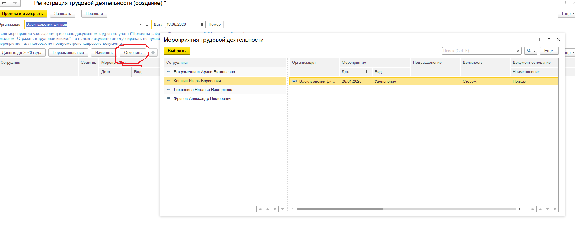 Далее в «Мероприятиях» по сотруднику открываем «Регистрация трудовой деятельности» и нажимаем кнопку «Отменить» (рис. 6).
