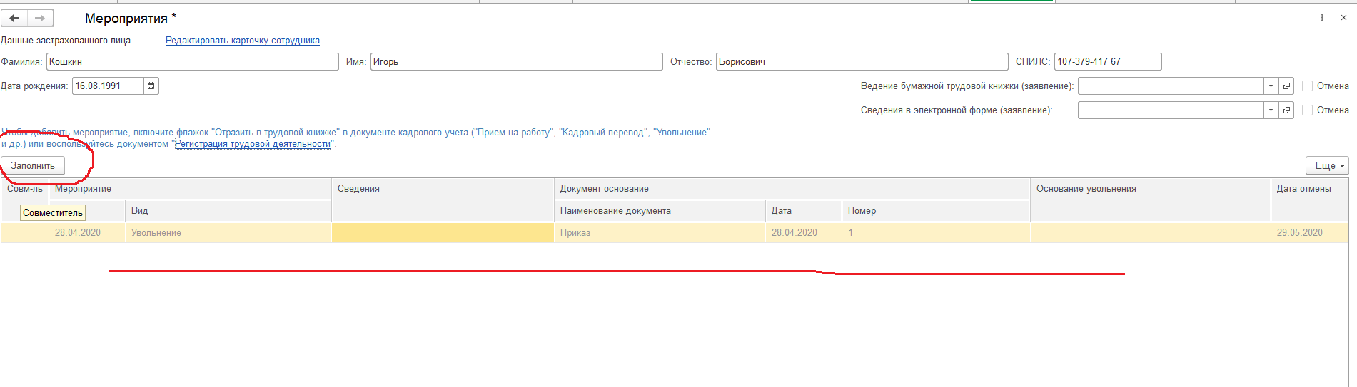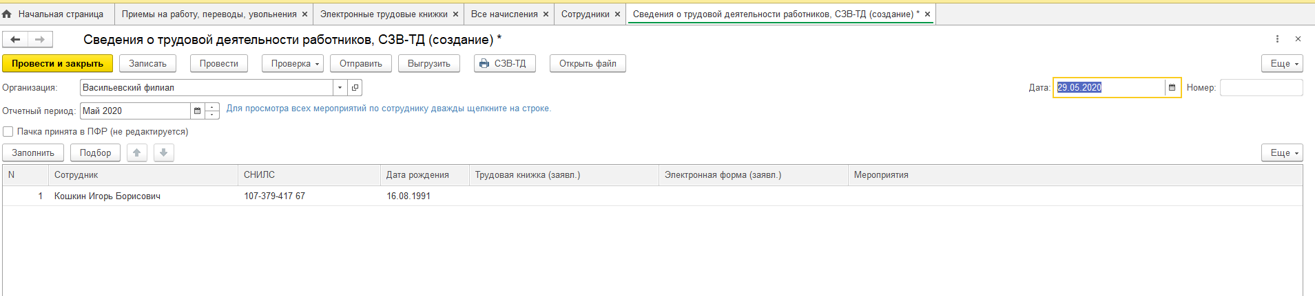 Стоит отметить, что при первой сдаче отчета по конкретному сотруднику в список мероприятий вносится текущие событие и последнее по нему в данной организации. Исключения составляют приемы на работу, так как гражданин прежде трудился не в этой компании.