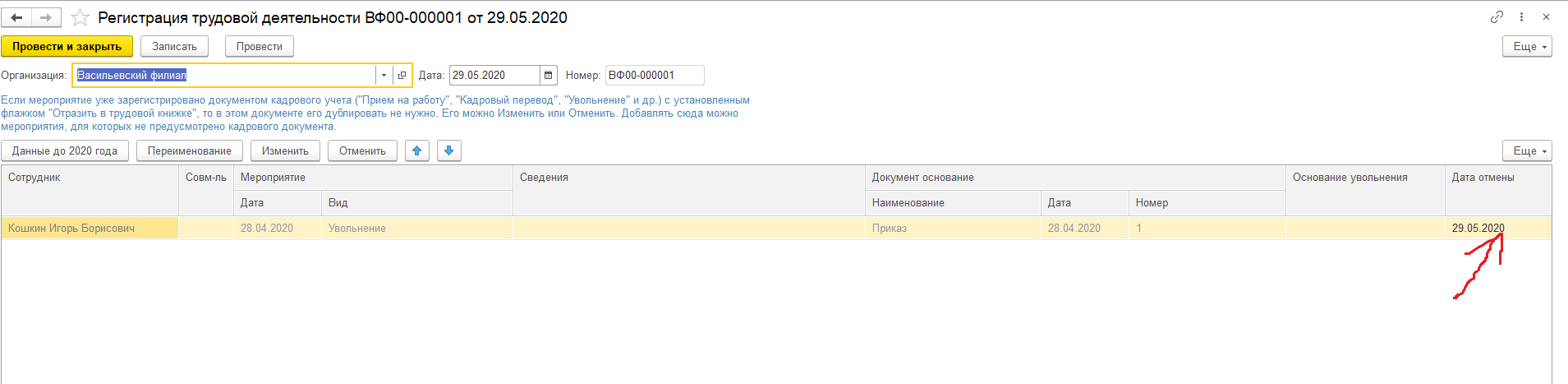 На очереди – указание в документе верной даты увольнения вместо некорректной и его проведение. Дата стала актуальной.