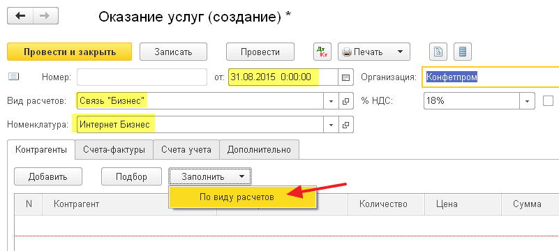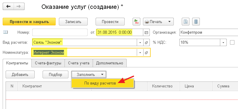 Для этого укажем вид расчета Связь «Эконом», номенклатуру (услугу) Интернет Эконом, а затем в табличной части нажмём кнопку «Заполнить»->»По виду расчетов»: