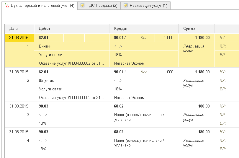 Проводим документ и видим, что сформировались все проводки, которые обычно формируются актом и счетом-фактурой, только для всех контрагентов сразу:
