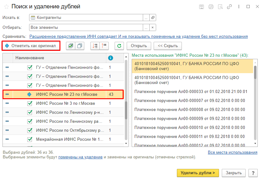 Если какой-то из объектов не обрабатываем, то флажок с него снимаем. Если мы изменяем объект, на который программа перенесет все данные с другого объекта при его удалении, то его нужно отметить, нажав кнопку «Отметить как оригинал».
