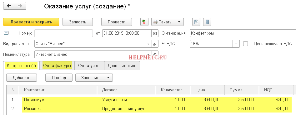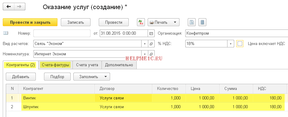 Цена в табличной части подставилась благодаря тому, что мы указали её в документе «Установка цен номенклатуры» для услуги «Интернет Эконом».