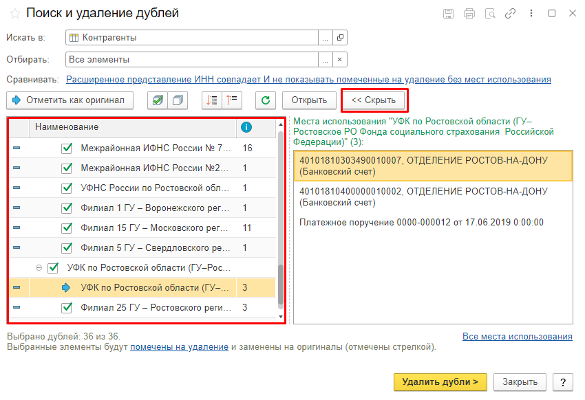 Если выделим элемент в левом окне справа, появится информация, где его использовали. Места использования дублей можете свернуть по кнопке «Скрыть». Или наоборот — если надо, откройте тот документ, в котором данные дубли использовали. Рядом с элементом увидите количество объектов, где он задействован.