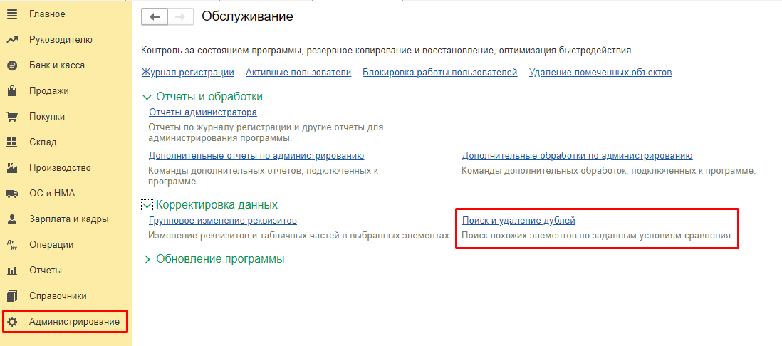 Чтобы найти и удалить дубли в программе»1С:Бухгалтерия 8«, ред. 3, воспользуйтесь специальной обработкой. Она находится в разделе «Администрирование» — «Обслуживание», гиперссылка «Поиск и удаление дублей».