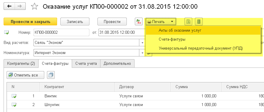 Из этого же документа мы можем напечатать акты, счета-фактуры или упд сразу для всех контрагентов: