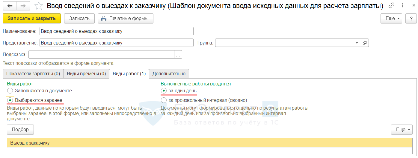Если выбран пункт «Выбираются заранее», тогда в шаблоне настраиваются виды работ, по которым вводится данный шаблон.