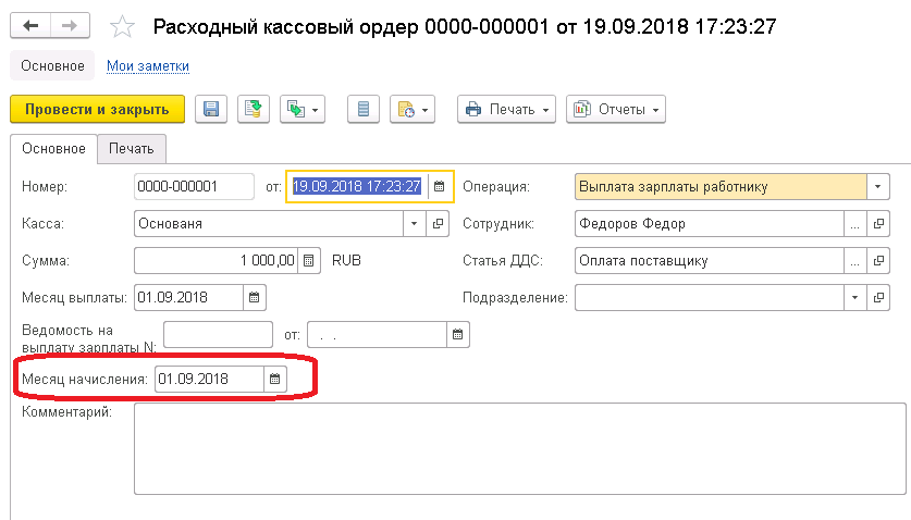 В этих документах при выборе операции «Выплата зарплата работнику» помимо поля «Сотрудник» появляется поле «Месяц начисления». В этом поле указываем месяц, за который производится выплата дохода.