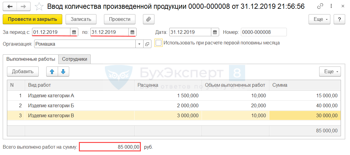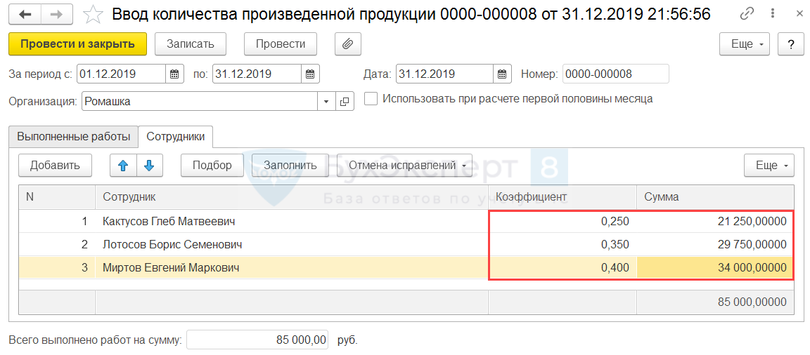 Общая стоимость произведенной за месяц продукции (85 000 руб.) распределяется между сотрудниками в зависимости от коэффициентов:
