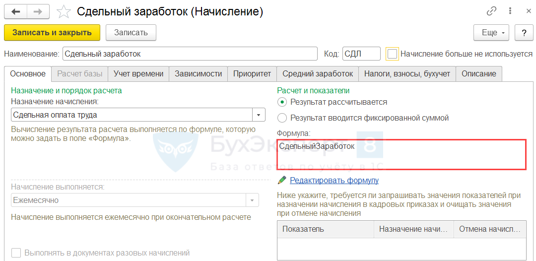Если в организации не предусмотрено сравнение сдельного заработка с повременной оплатой, рассчитанной исходя из оклада или часовой ставки, можно изменить Формулу типового начисления или создать отдельное Начисление ( Настройки – Начисления ).