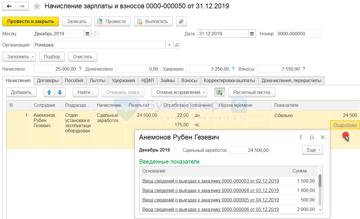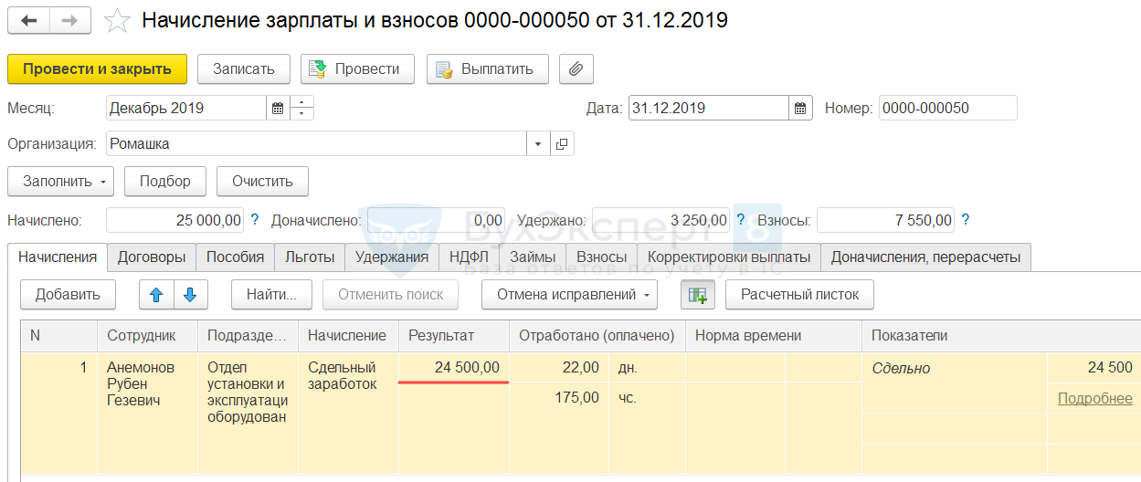 Создадим документ Начисление зарплаты и взносов для расчета заработной платы сотрудников за декабрь 2019. В результате автоматического расчета суммы начислений по Лотосову Б.С. (29 750 руб.) и Миртову Е.М. (34 000 руб.) совпадают с размером их сдельного заработка. Сумма сдельного заработка Кактусова Г.М. (21 250 руб.) оказалась меньше установленного сотруднику оклада (25 000 руб.). В результате Кактусову Г.М. была начислена большая из сравниваемых величин (25 000 руб.).