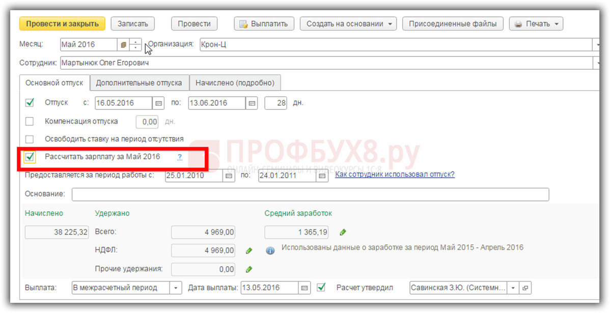 Расчет и выплата отпускных Расчёт отпускных в документе “Отпуск” также можно производить начисление заработной платы за дни и месяцы перед отпуском. Также материальную помощь к отпуску. В документе “Отпуск” можно рассчитать налог на доходы физ.