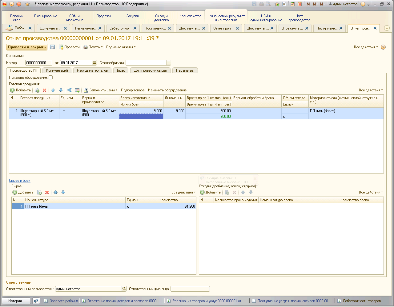 Используя сырье, мы изготавливаем Шнур якорный 6,0 мм (500 м) в количестве 9 штук (9 бухт). Для этого в программе «1С:Управление торговлей + Производство» мы заполняем документ «Отчет производства» следующим образом