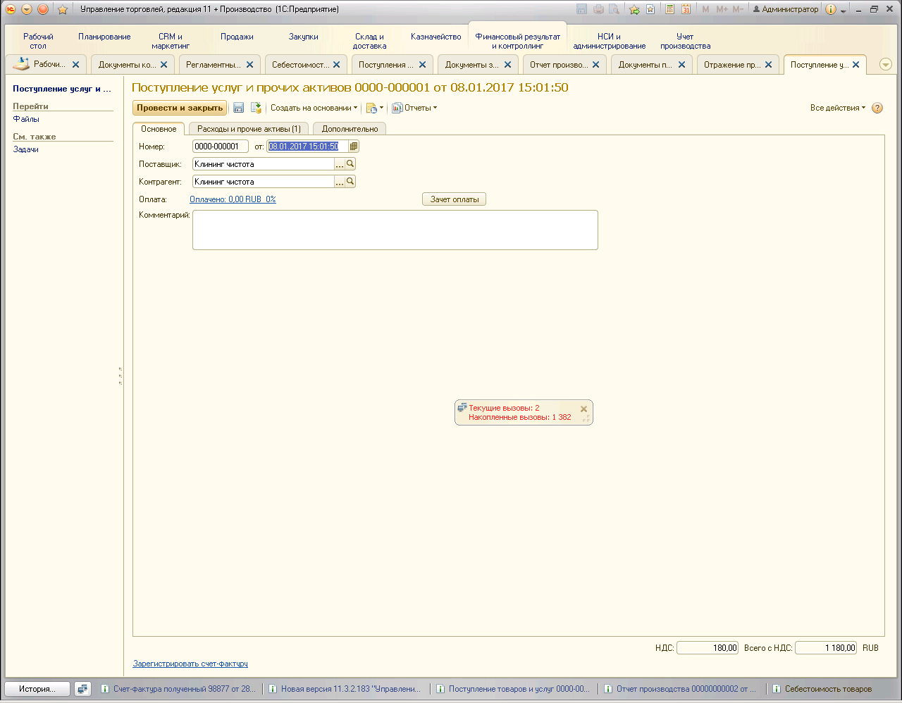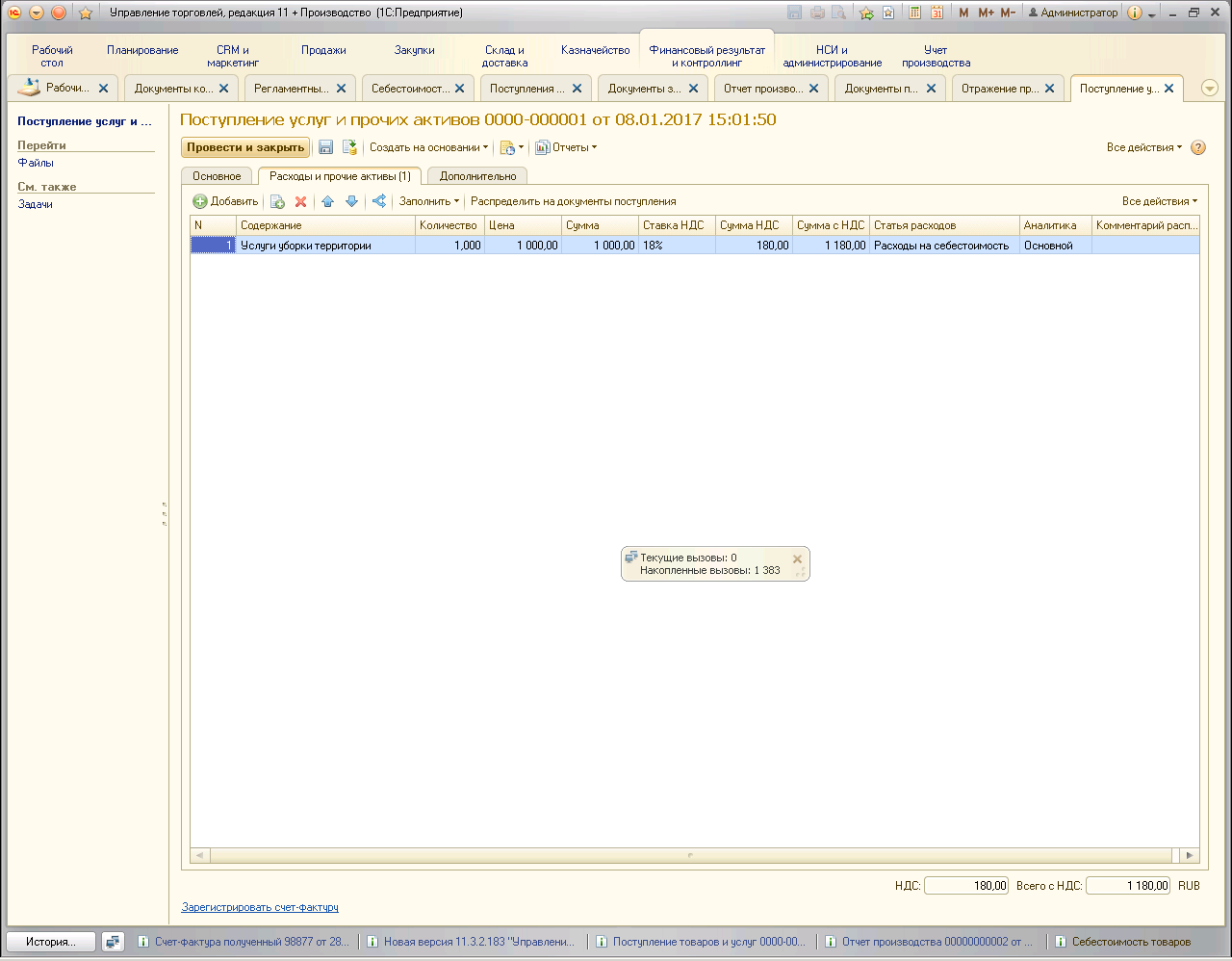 Для примера рассмотрим поступление услуг по уборке производственных помещений. И поставим задачу, что бы сумма услуг распределялась на себестоимость выпускаемой продукции.
