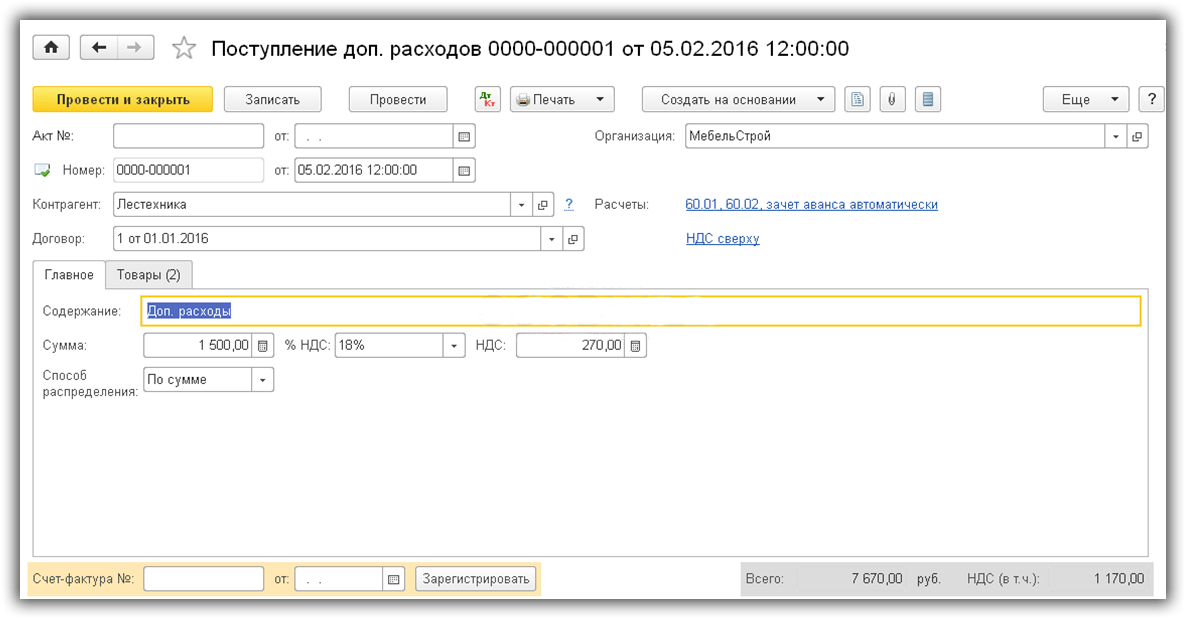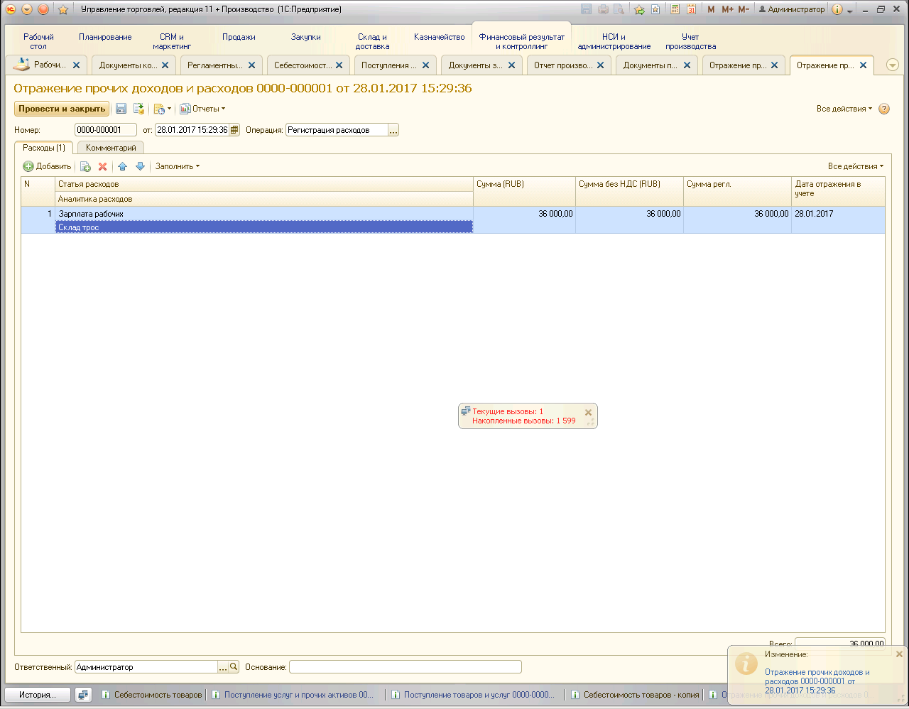 - Регистрация расходов – отражение произвольных затрат по выбранной статье расходов,