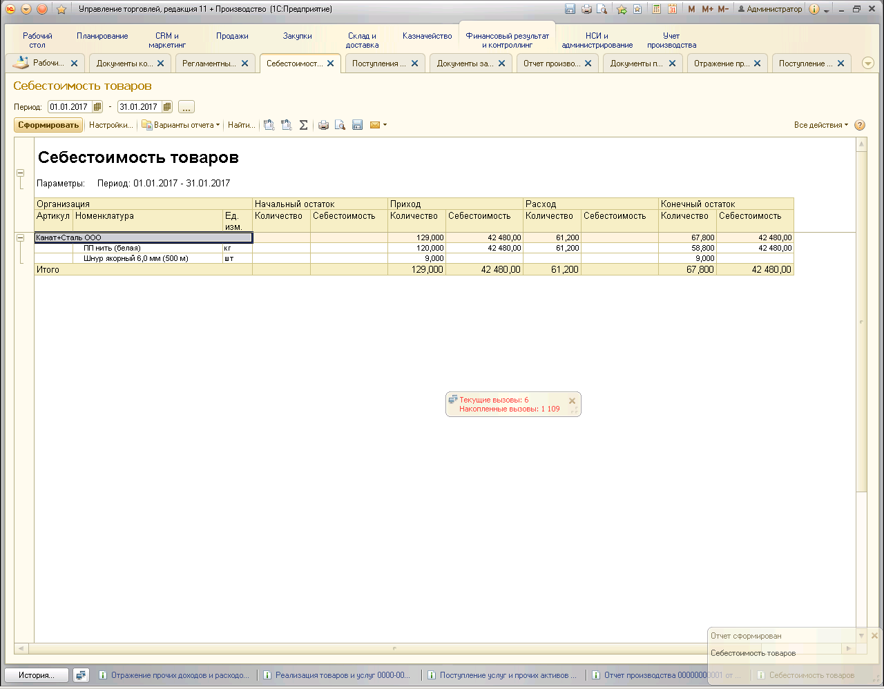 Рассмотрим алгоритм калькуляции изделия в 1С 8.3. Первоначальная себестоимость продукции сформируется при ее выпуске и будет равна: