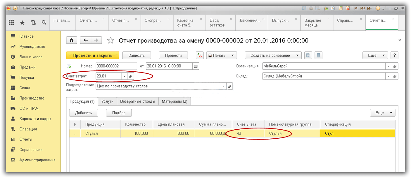 Важно соблюдать соответствие аналитики выпущенной продукции и затрат. Например, если продукция выпущена по номенклатурной группе «Стулья», то и затраты должны быть отнесены на эту номенклатурную группу