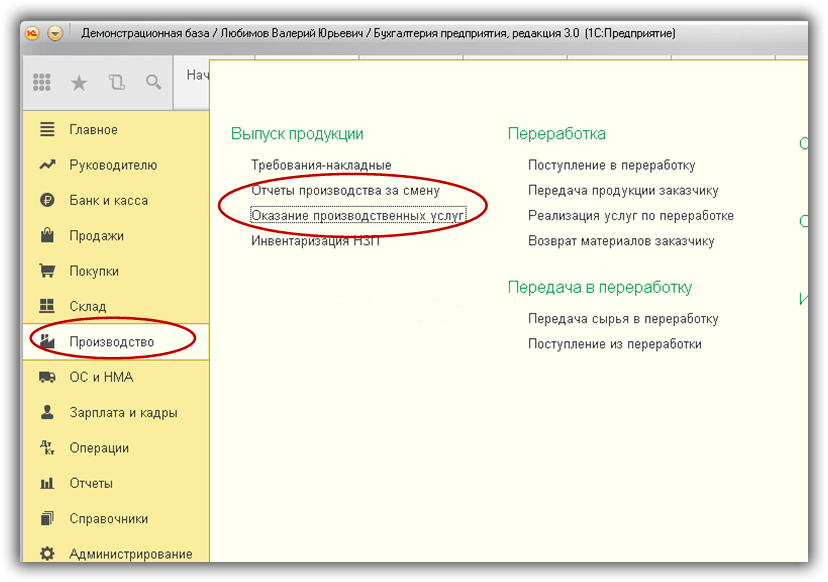 Оба документа находятся в разделе «Производство» (рис.6). Реализацию услуг можно отразить также документом «Реализация(акты, накладные)» из раздела «Продажи», но по этому документу себестоимость услуг не рассчитывается.