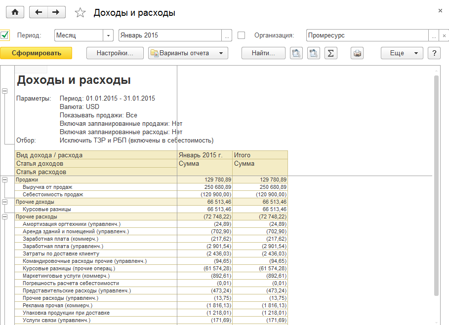 Комплексный анализ всех доходов и расходов компании в разрезе статей выполняется на основе отчета Доходы и расходы.