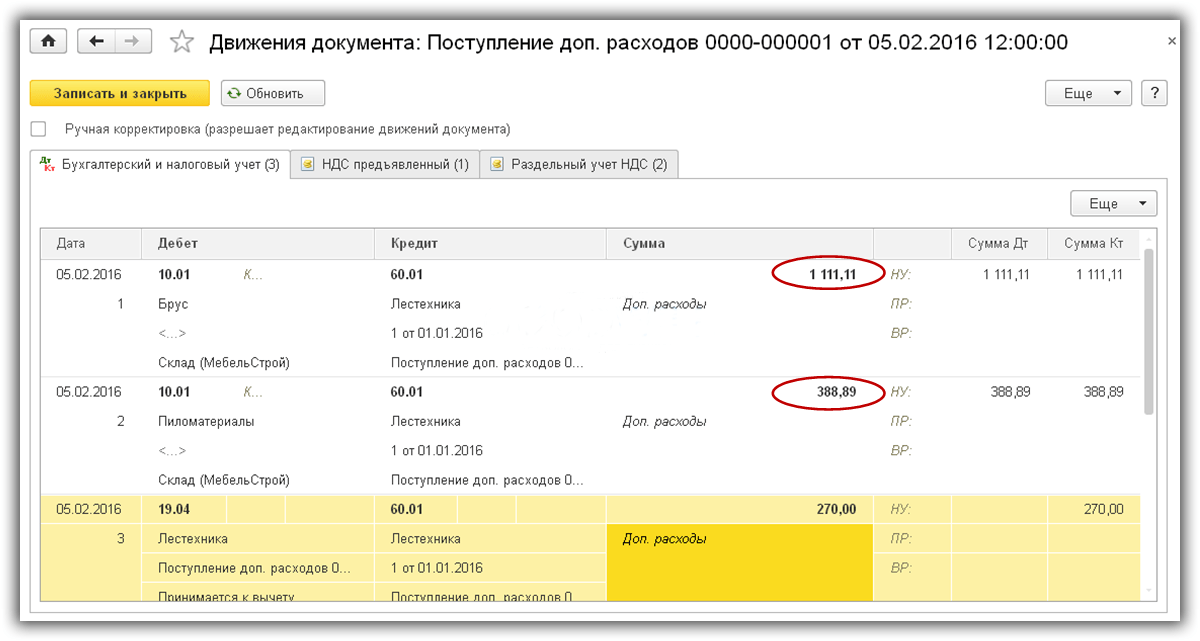 На рис.4 видны проводки, по которым стоимость бруса и пиломатериалов на складе увеличена соответственно на 1111,11 и 388,89 руб.