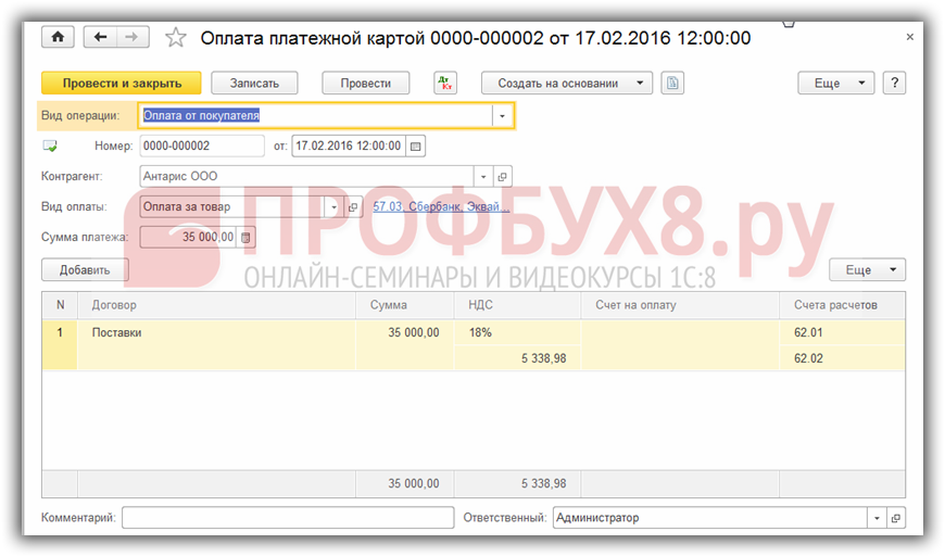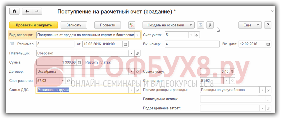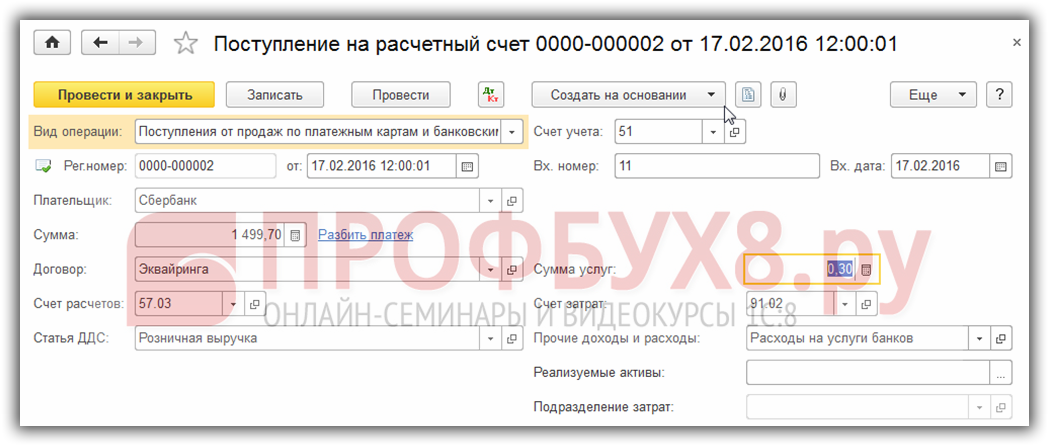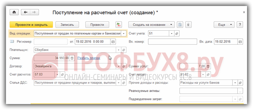 Шаг 2. Как отразить эквайринг в 1С 8.3