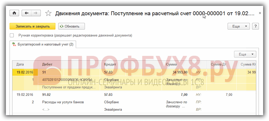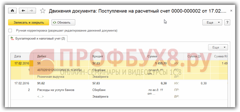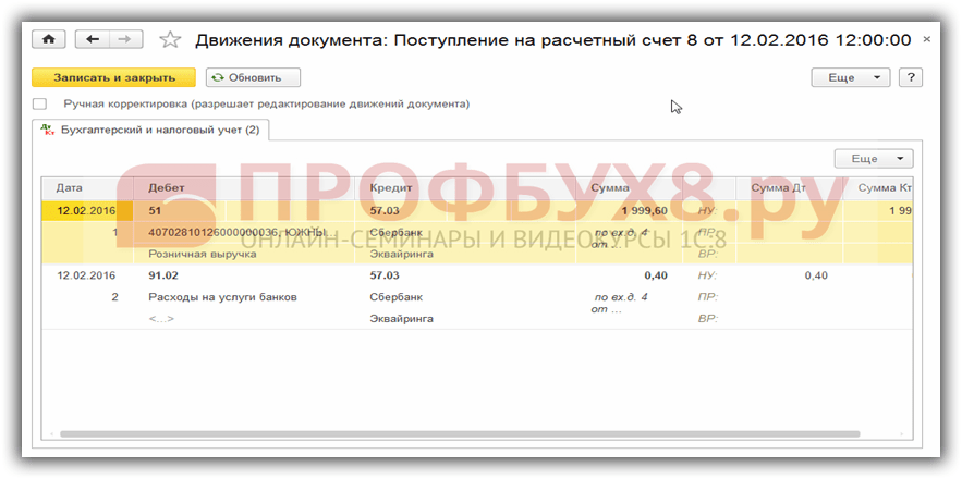 После чего в 1С 8.3 закрывается задолженность банка – эквайера и формируется проводка по услугам банка по эквайрингу. Движение по документу будет следующим:
