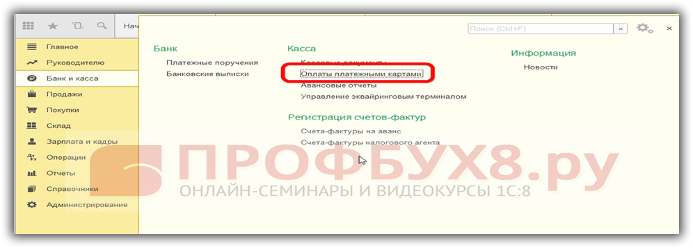 Оплата банковскими (платежными) картами в 1С Бухгалтерия 8.3