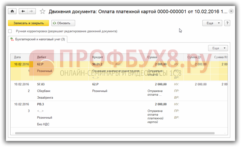 Проводки по эквайрингу в розницу документа Оплата платежной картой