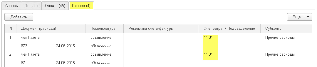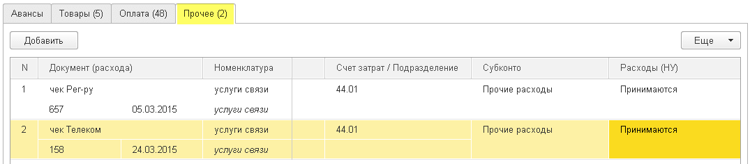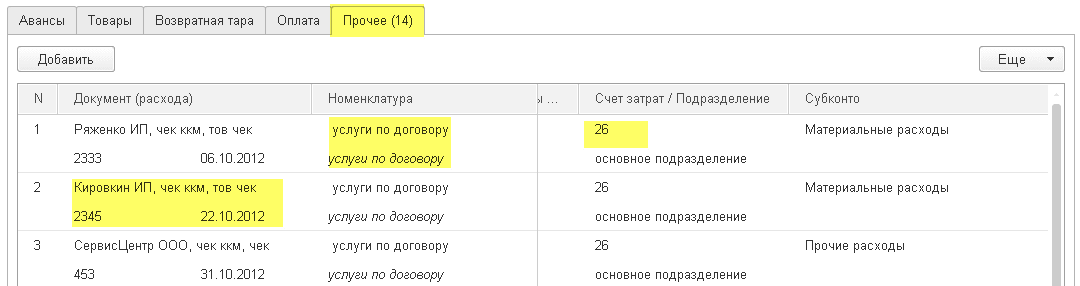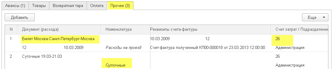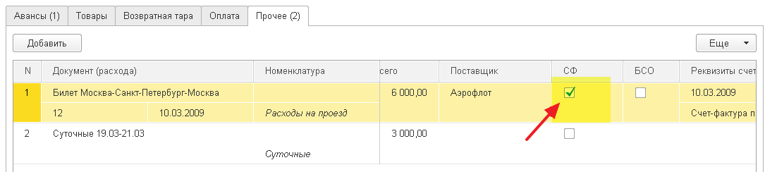 Кстати, на закладках «Товары» и «Прочее» присутствует галка «СФ», если её поставить, то по этой строке введётся Счёт-фактура полученная: