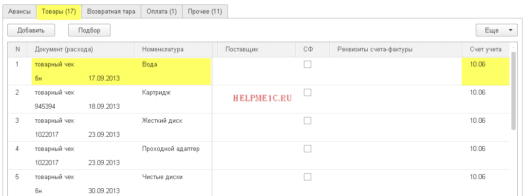 Заполняем закладку «Товары» (купили кучу всего и поставили на десятку):